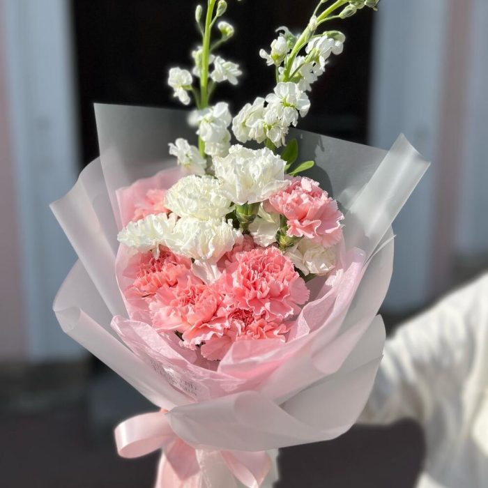 Гвоздика – 13 шт.Маттиола белая – 2 шт.Дизайнерская упаковка – 1 шт.
