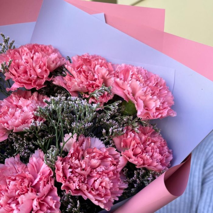 Лимониум – 2 шт.Лента атласная – 2 шт.Диантус розовый – 9 шт.Упаковка корейская пленка – 1 шт.