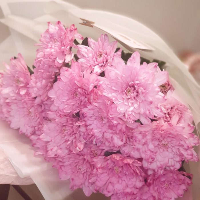 Хризантема кустовая – 5 шт.Лента атласная – 1 шт.Упаковка дизайнерская – 2 шт.Кризал (подкормка) – 1 шт.