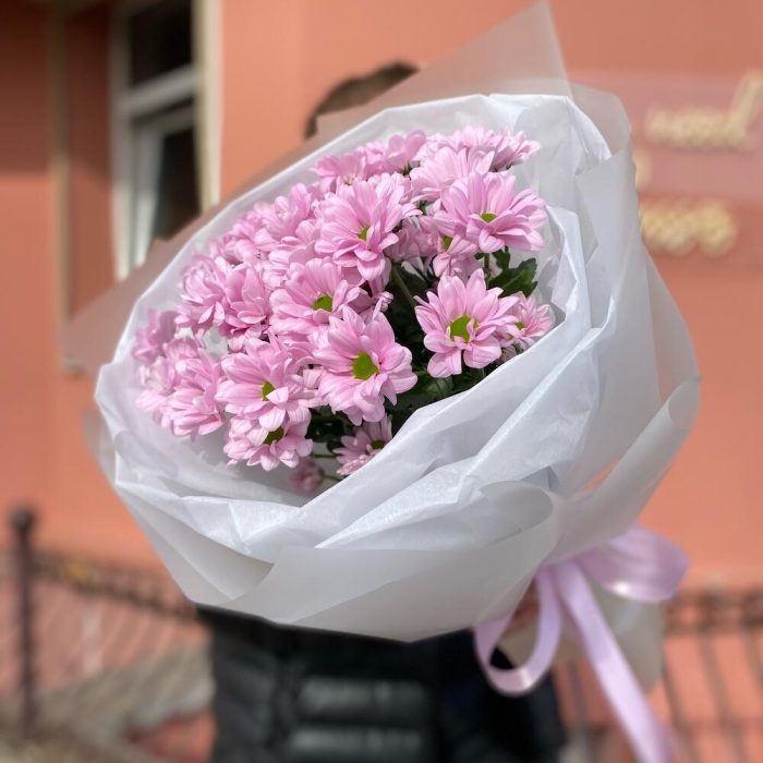 Лента атласная – 1 шт. Тишью – 1 шт. Ромашковая хризантема – 5 шт. Дизайнерская упаковка – 1 шт.