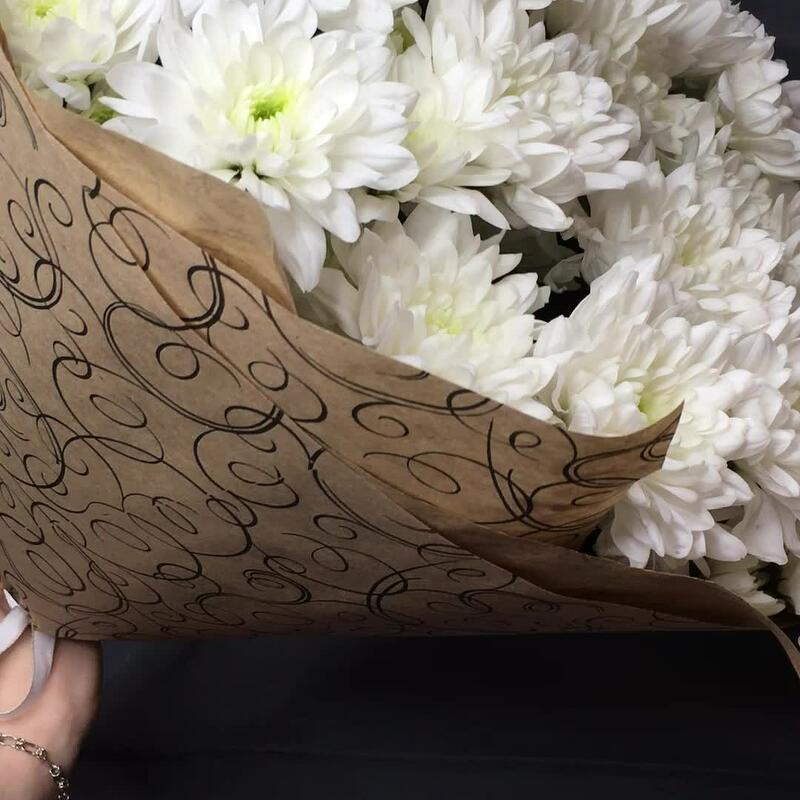 Лента атласная – 1 шт.Хризантема кустовая белая – 7 шт.Упаковка дизайнерская – 1 шт.