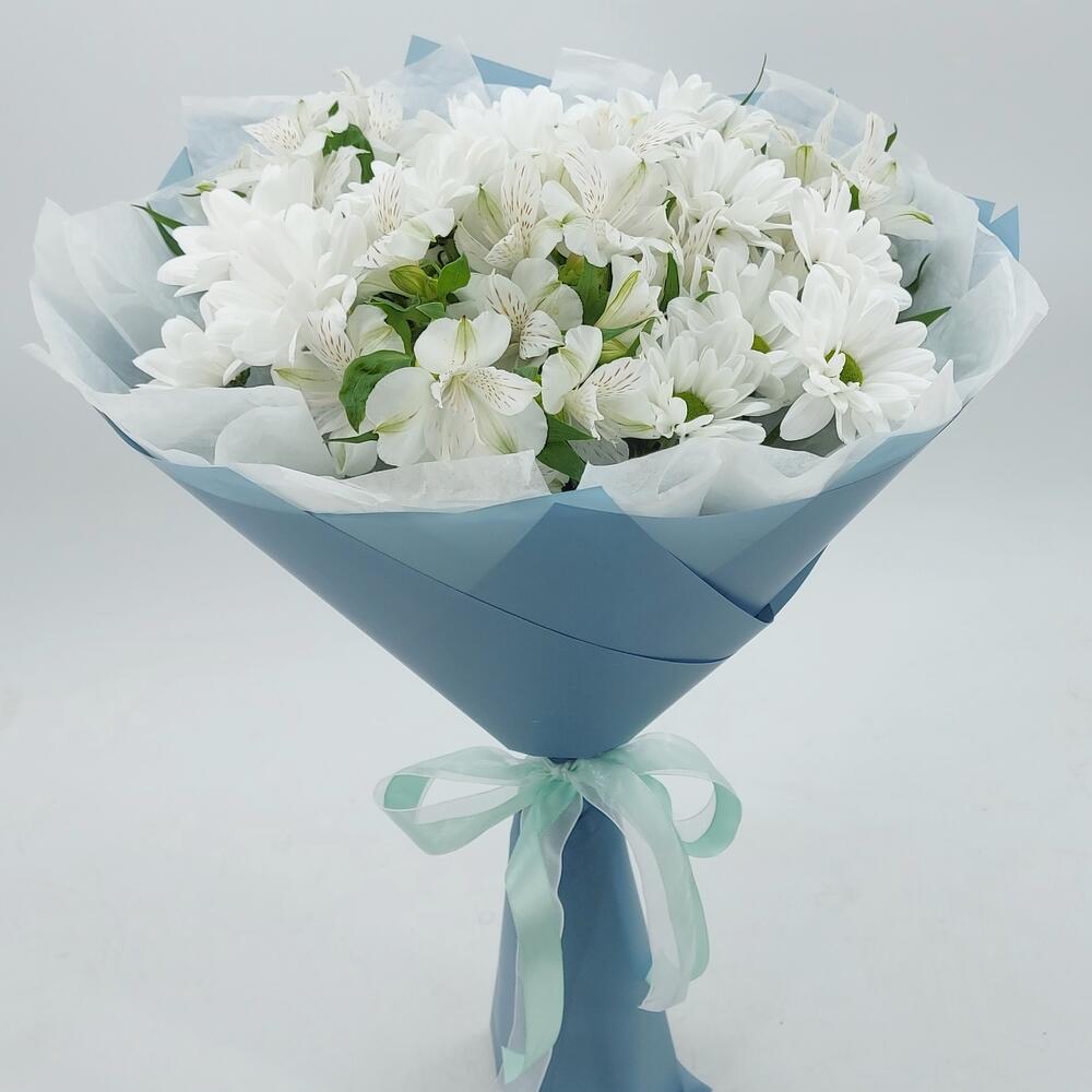 Стойкий букет из ромашковых хризантем и альстромерий. Такой букет всегда уместен и подойдёт для любого повода: День Рождения, именины, годовщина свадьбы, рождение ребенка, 8 марта, День Святого Валентина, выпускной и т.д. Можно вручить маме, сестре, подруге, коллеге, учителю, любимой.