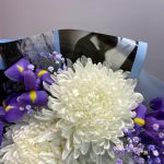 Хризантема – 3 шт.Ирис Blue Magic – 5 шт.Гипсофила – 1 шт.оформление дизайнерское – 1 шт.