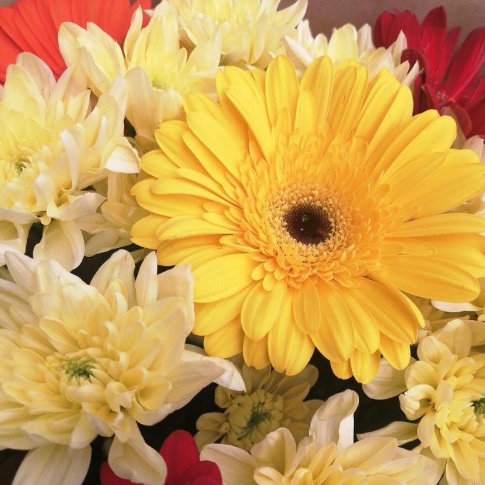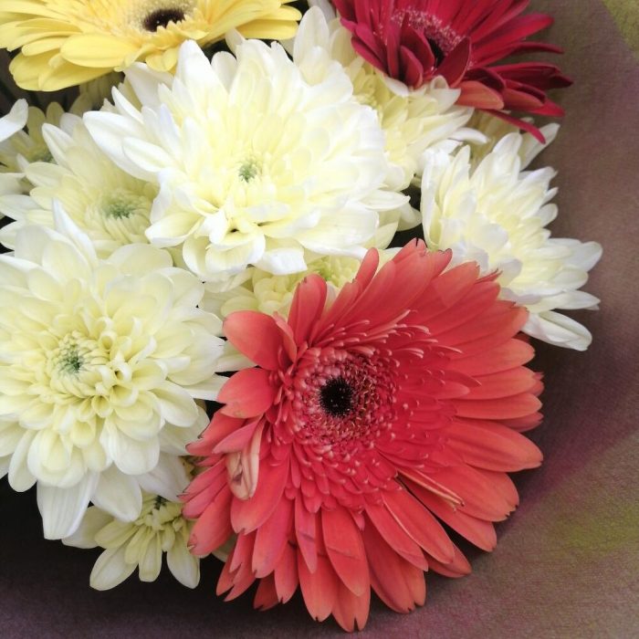 Гербера – 5 шт.Хризантема кустовая – 4 шт.Упаковка – 1 шт.