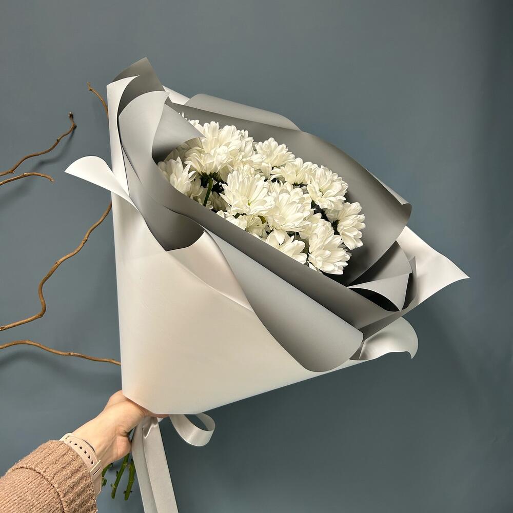 Хризантема кустовая – 5 шт.Упаковка – 2 шт.Лента атласная – 1 шт.