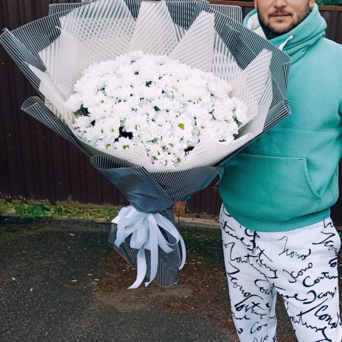 Лента атласная – 2 шт.Упаковка дизайнерская – 1 шт.хризантема кустовая кеннеди – 25 шт.