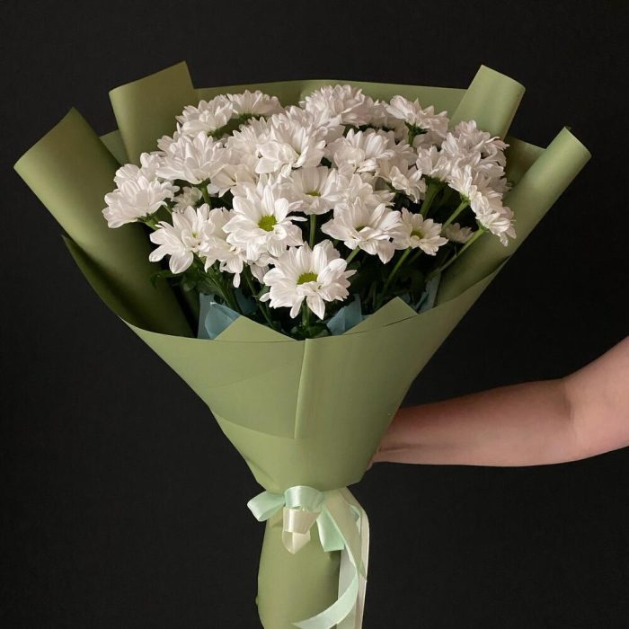 Хризантема кустовая – 7 шт. Лента атласная – 2 шт. Тишью – 2 шт. Салфетки – 4 шт. Слюда упаковка – 2 шт.