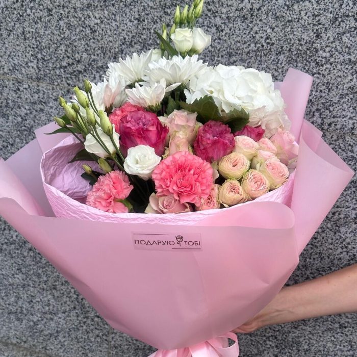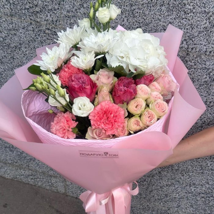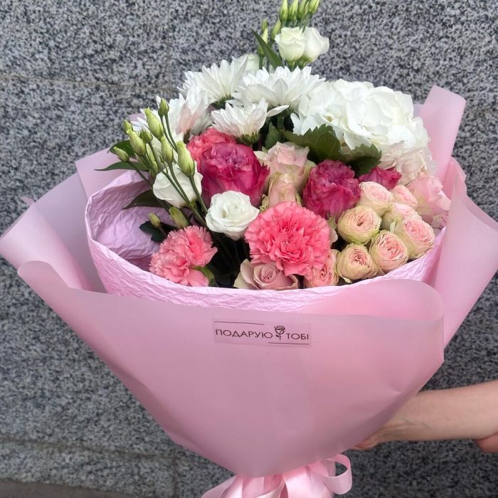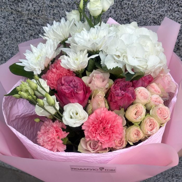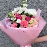 Букет из эустом, кремовой гвоздики и озотамнуса