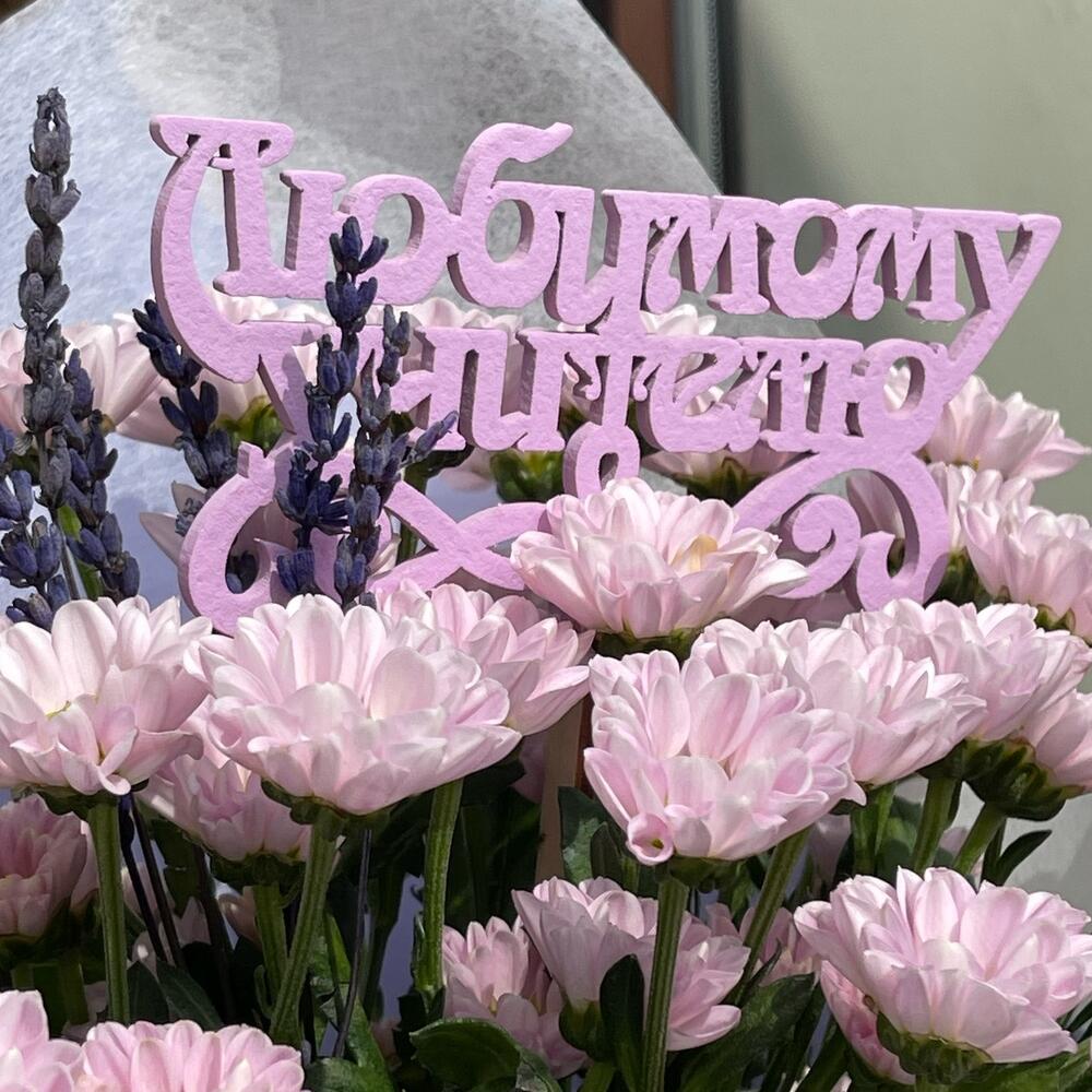 Хризантема Сантини – 5 шт.Лаванда (сухоцвет) – 7 шт.Упаковка – 1 шт.Лента – 1 шт.Открытка мини – 1 шт.Топпер деревянный – 1 шт.
