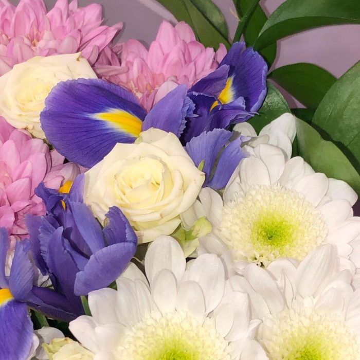 Ирис – 4 шт.микс хризантем – 3 шт.Лизиантус – 2 шт.листики – 3 шт.Упаковка – 1 шт.