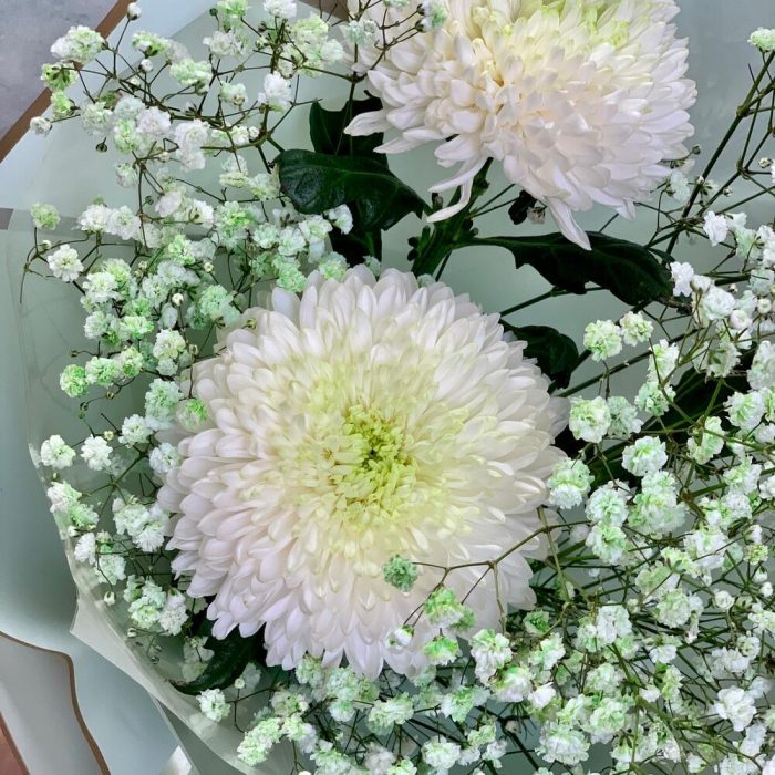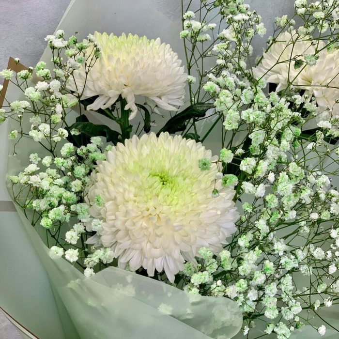 Хризантема магнум – 3 шт.Гипсофила – 3 шт.Рускус – 2 шт.Упаковка дизайнерская – 2 шт.