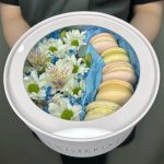 Живые цветы и макаруны в круглой коробке