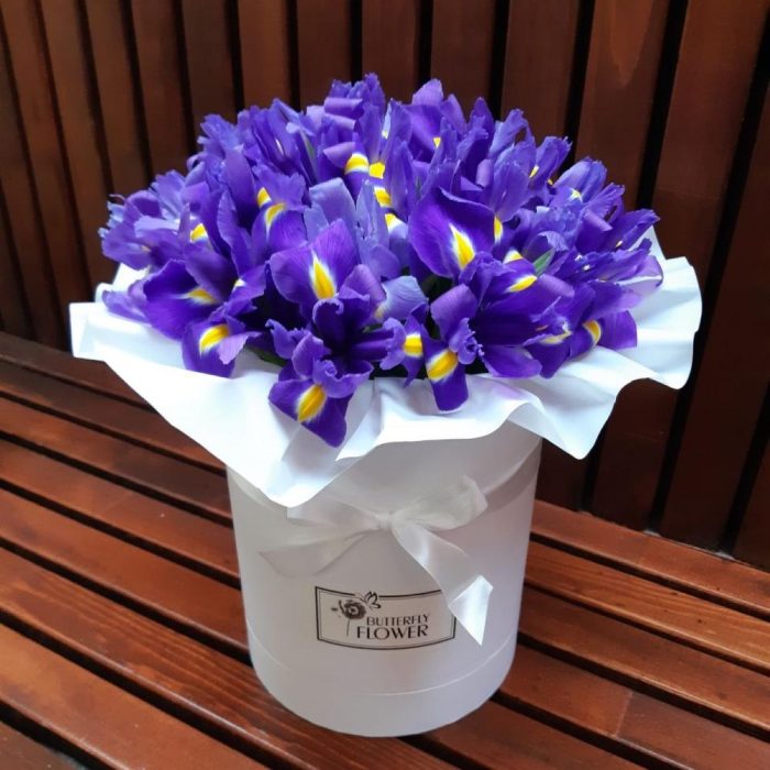 Красивый, яркий букет из 35 ирисов в белой шляпной коробке “Байкал”