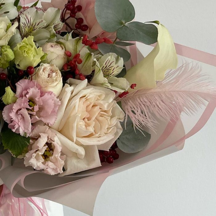 Альстромерия – 4 шт.Гиперикум – 1 шт.Роза Эквадор – 2 шт.Эустома – 3 шт.Лента атласная – 2 шт.Роза пионовидная – 1 шт.Кустовая пионовидная роза – 2 шт.Пленка матовая – 6 шт.зелень декоративная – 4 шт.перо декоративное – 1 шт.