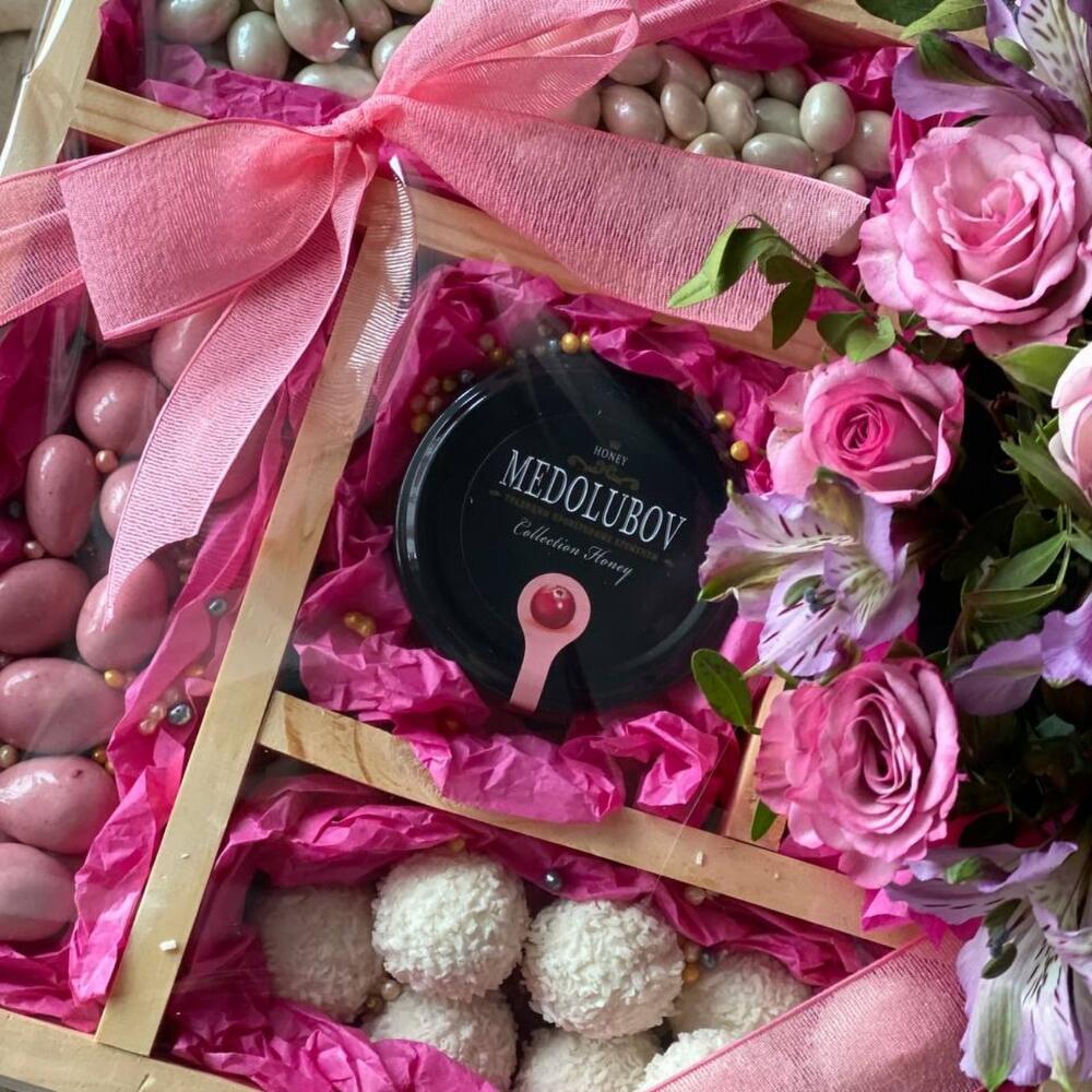 Набор в подарок из орехов в шоколаде, рафаэлло, мeда и роз