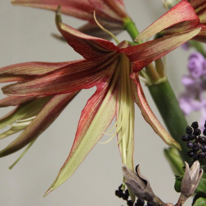 Лилия махровая – 3 шт.Амариллис – 1 шт.левкадендрон – 1 шт.Вибурнум – 3 шт.Эрингиум – 1 шт.Маттиола – 3 шт.магнолия ветка – 2 шт.эвкалипт стабилизируемый – 2 шт.Лента – 1 шт.