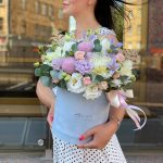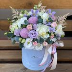 Цилиндр с гортензией, эустомой и кустовой розой