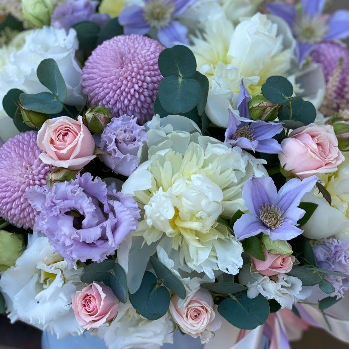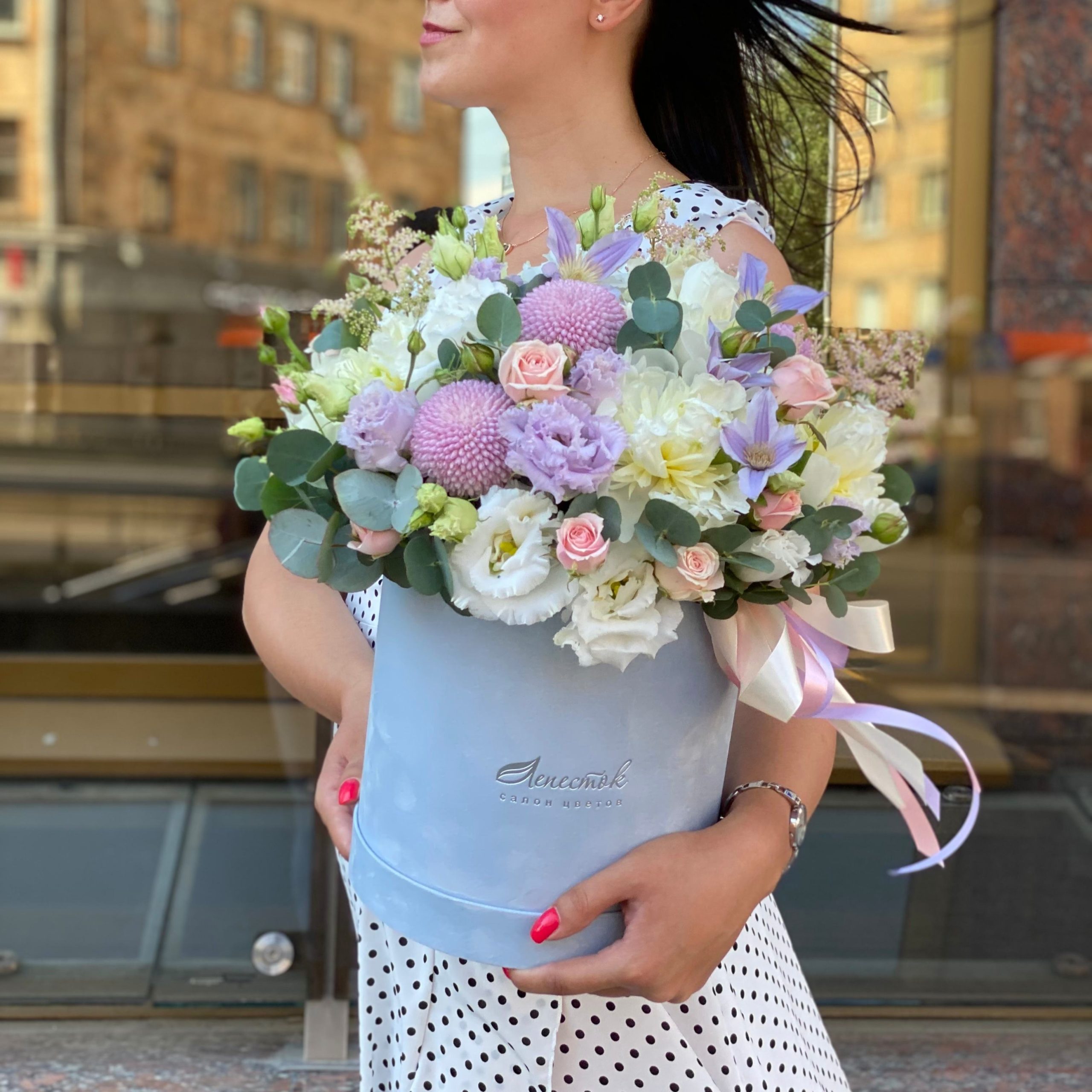 Цилиндр из гортензии, гвоздики и эустомы