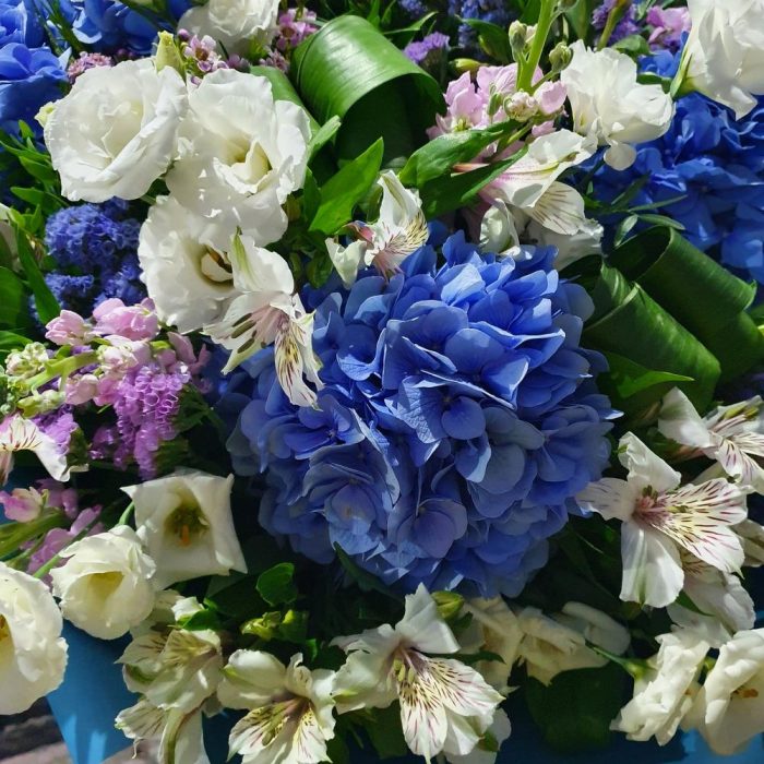 Гортензия синяя – 5 шт.Альстромерия – 10 шт.Статица – 10 шт.Лизиантус – 9 шт.Маттиола – 8 шт.Фисташка – 15 шт.Ваксфлауэр – 1 шт.Зелень – 15 шт.Упаковка дизайнерская – 3 шт.Лента атласная – 1 шт.Аспидистра – 4 шт.