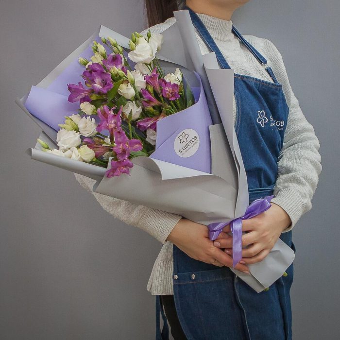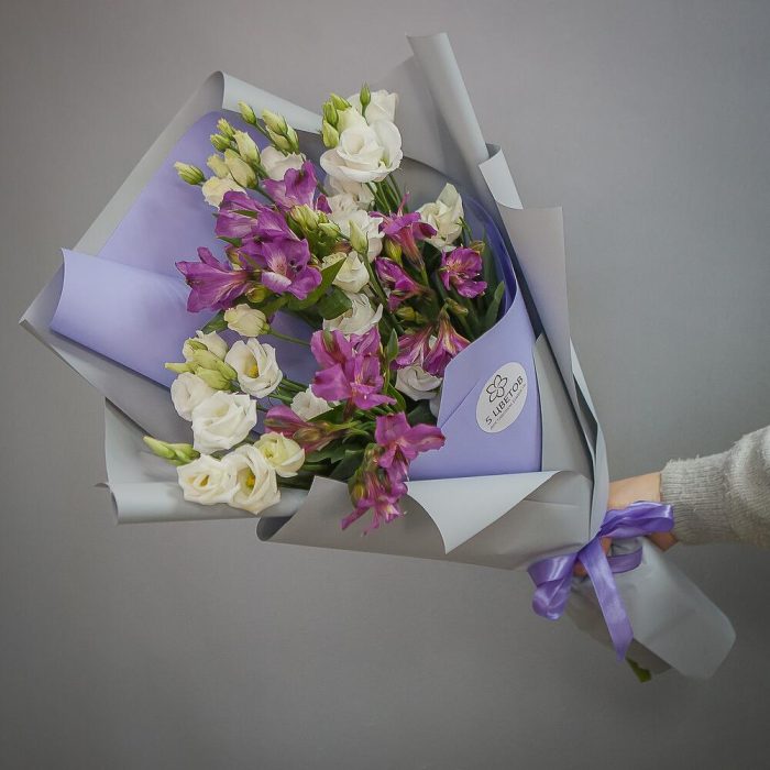 Альстромерия – 3 шт.Упаковка – 1 шт.Атласная лента – 1 шт.эустома белая – 5 шт.