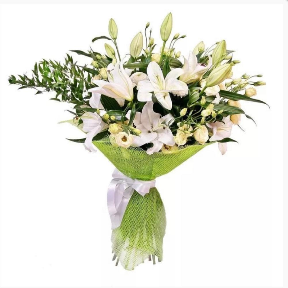 лилии – 3 шт.Эустома – 1 шт.Зелень – 1 шт.дизайнерская упаковка и атласная лента – 1 шт.