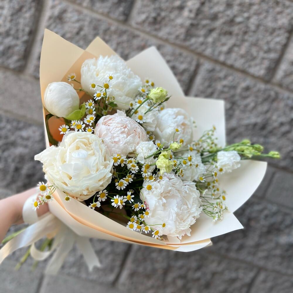 Эустома – 1 шт.Лента атласная – 2 шт.Ромашка кустовая – 7 шт.Пион белый – 6 шт.Упаковка дизайнерская – 5 шт.