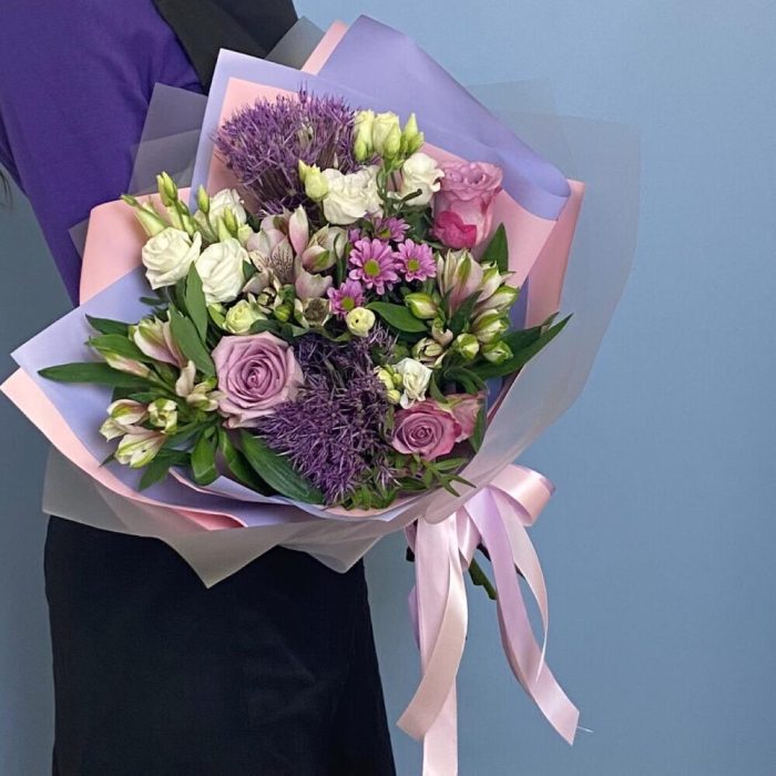 Альстромерия – 3 шт.Лизиантус – 2 шт.Лента атласная – 2 шт.Сантини – 1 шт.Фисташка – 3 шт.Аллиум – 2 шт.Упаковка дизайнерская – 2 шт.Роза премиум – 3 шт.