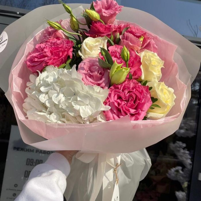 Гортензия – 1 шт. белые розы – 3 шт. пионовидные розы – 5 шт. Лизиантус – 2 шт.