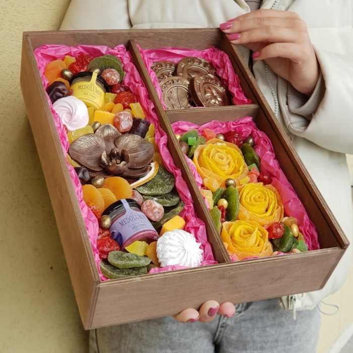 арахис в кунжуте – 160 гр.арахис в белом шоколаде – 100 гр.ананас кубики – 165 гр.арахис в сахарной глазури – 100 гр.Фундук – 100 гр.Крем мед – 2 шт.шоколадная орхидея – 1 шт.Киви – 145 гр.Курага – 72 гр.кизил – 90 гр.Финики – 42 гр.долька апельсина – 1 шт.кумкват в сахарной пудре – 25 гр.манговые конфеты – 2 шт.Папайя – 40 гр.манго вяленый – 107 гр.арахис в темном шоколаде – 80 гр.Кешью – 15 гр.грецкий орех в шоколаде – 30 гр.шоколадные подковы с пожеланиями – 4 шт.манго в сахаре – 100 гр.Деревянная надпись – 1 шт.