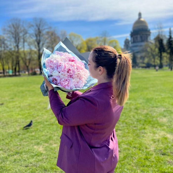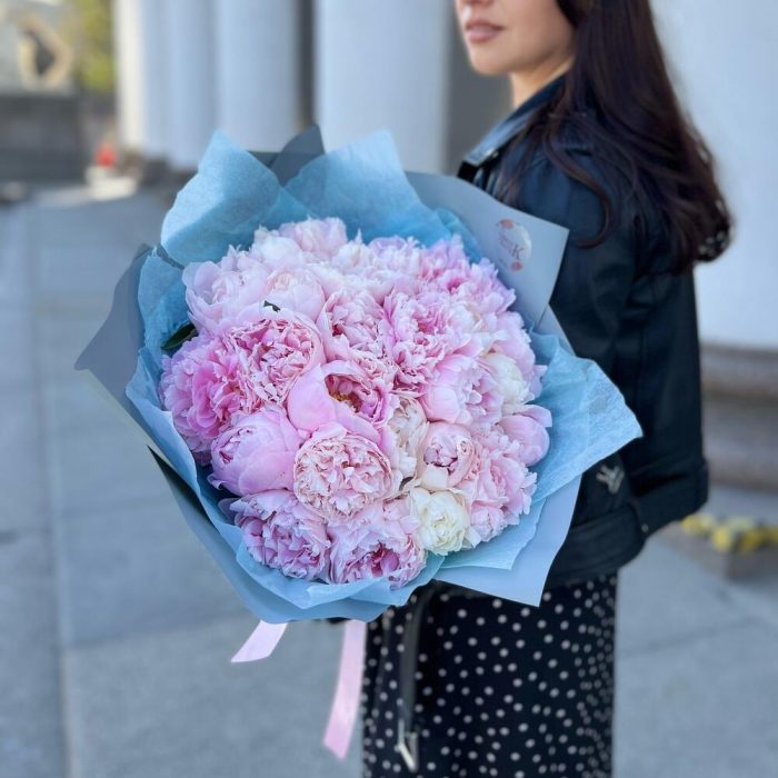 Лента атласная – 2 шт.Пион Сара Бернар – 25 шт.Упаковка дизайнерская – 2 шт.коробка транспортировочная – 1 шт.подкормка для срезанных цветов – 1 шт.крафт конверт – 1 шт.инструкция по уходу за цветами – 1 шт.аквапак с водой – 1 шт.