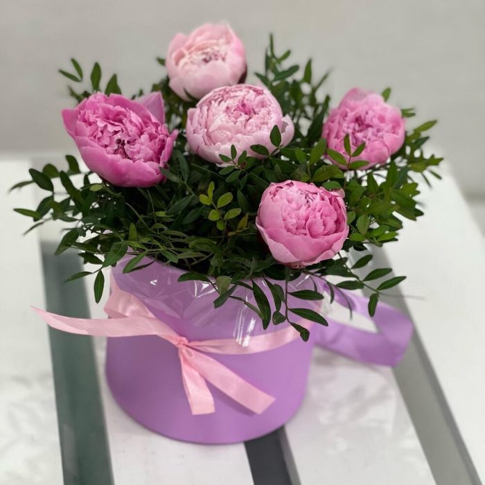 Фисташка – 5 шт.Пион Сара Бернар – 5 шт.коробочка с оазисом и лентами – 1 шт.