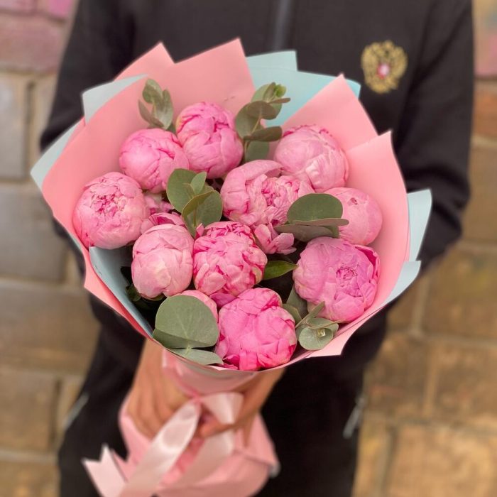 Эвкалипт – 5 шт.Лента атласная – 1 шт.Пион Сара Бернар – 11 шт.Упаковка дизайнерская – 1 шт.