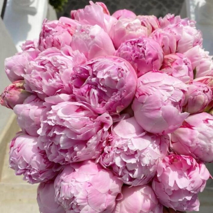 Пион розовый – 25 шт.Лента атласная – 2 шт.Открыточка с вашими пожеланиями – 1 шт.хорошее настроение – 100 шт.инструкция по уходу за цветами – 1 шт.коробка переноска – 1 шт.Кризал – 1 шт.