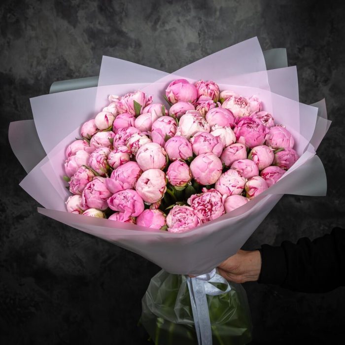 пионы розовые премиум – 51 шт.Лента атласная – 3 шт.Упаковка дизайнерская – 3 шт.Открыточка с вашими пожеланиями – 1 шт.хорошее настроение – 100 шт.коробка переноска – 1 шт.