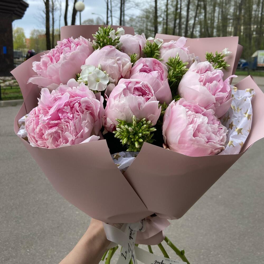 Пион Сара Бернар – 9 шт.Упаковка дизайнерская – 5 шт.Флокс белый – 6 шт.