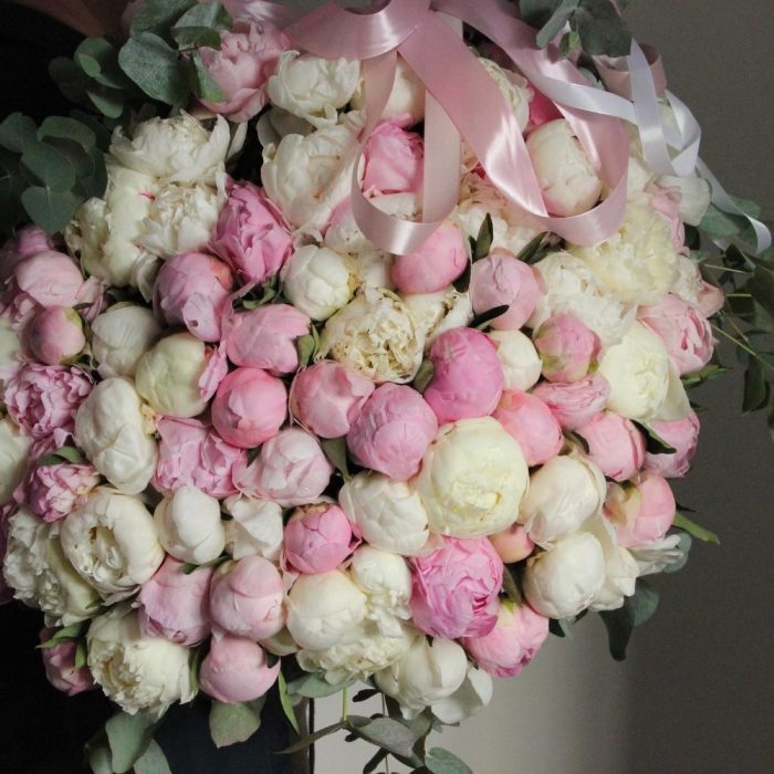 Эвкалипт – 15 шт.Лента атласная – 3 шт.пион франция – 75 шт.