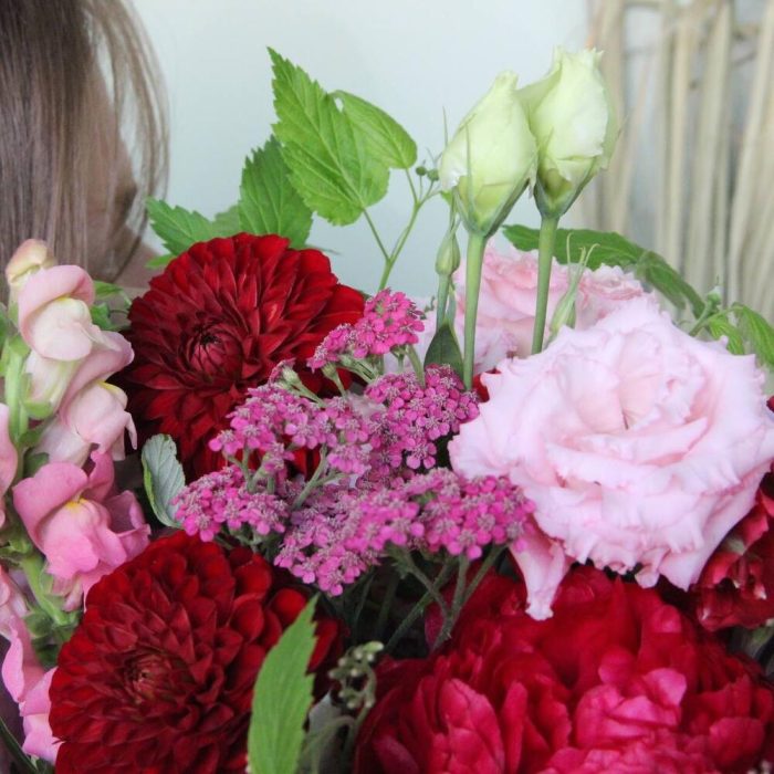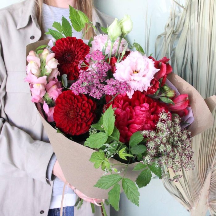 Георгина – 2 шт.Пион – 2 шт.даукус – 1 шт.Альстромерия – 1 шт.лизтантус – 1 шт.Львиный зев – 1 шт.Ахиллея – 1 шт.Ветки малины – 2 шт.Фисташка – 1 шт.Упаковка – 1 шт.Лента – 1 шт.
