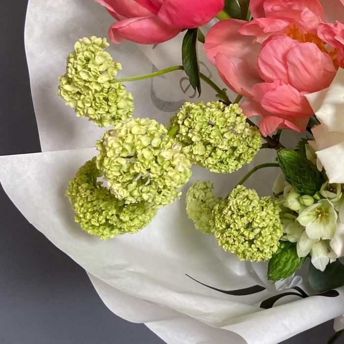 Пион – 3 шт.Вибурнум – 1 шт.плайя бланка – 4 шт.Орнитогалум – 3 шт.ветки декоративные – 2 шт.Упаковка дизайнерская – 1 шт.