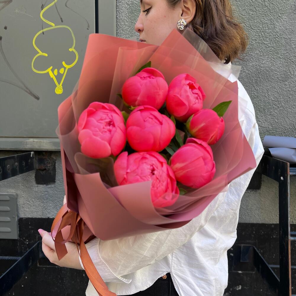Лента атласная – 2 шт.Пленка матовая – 7 шт.Пион коралл шарм – 7 шт.