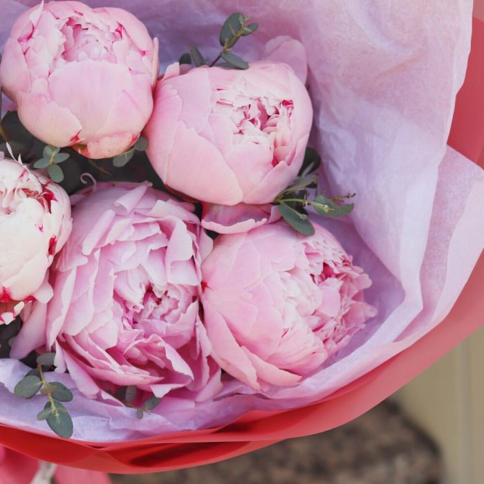 Эвкалипт – 1 шт.Пион Сара Бернар – 5 шт.Открыточка с вашими пожеланиями – 1 шт.Дизайнерская упаковка – 1 шт.