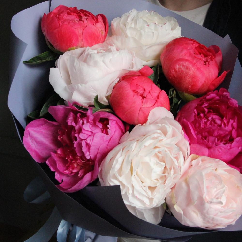 Моно букет из коралловых, белых и розовых пионов в лаконичной упаковке.Стильное цветочное решение для любого случая.