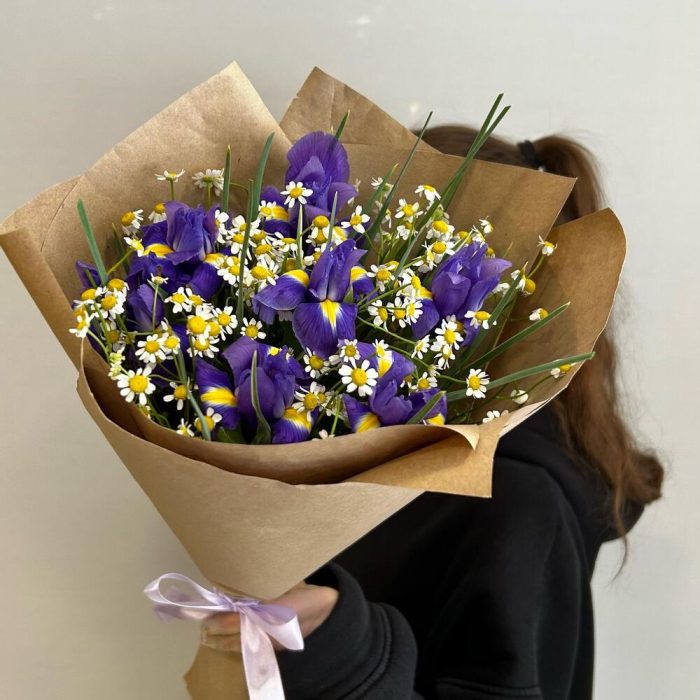 Букет из нежной ромашки и ярких фиолетовых ирисов
