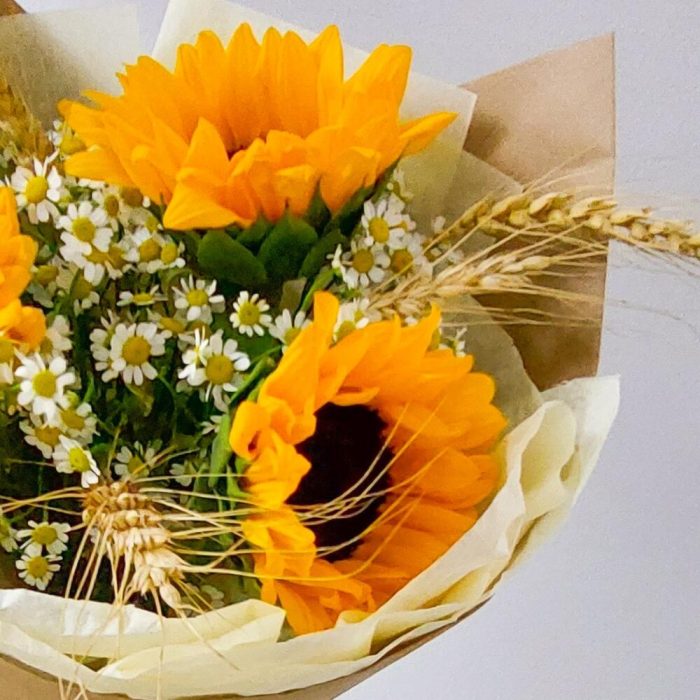 Лента атласная – 2 шт.Тишью – 1 шт.Подсолнух Голландский – 3 шт.Открыточка с вашими пожеланиями – 1 шт.бумага крафт – 1 шт.транспортировочная упаковка – 1 шт.пшеница натуральная – 5 шт.танацетум ромашка – 5 шт.