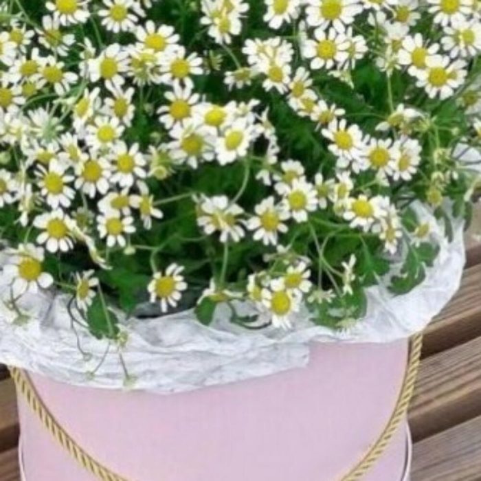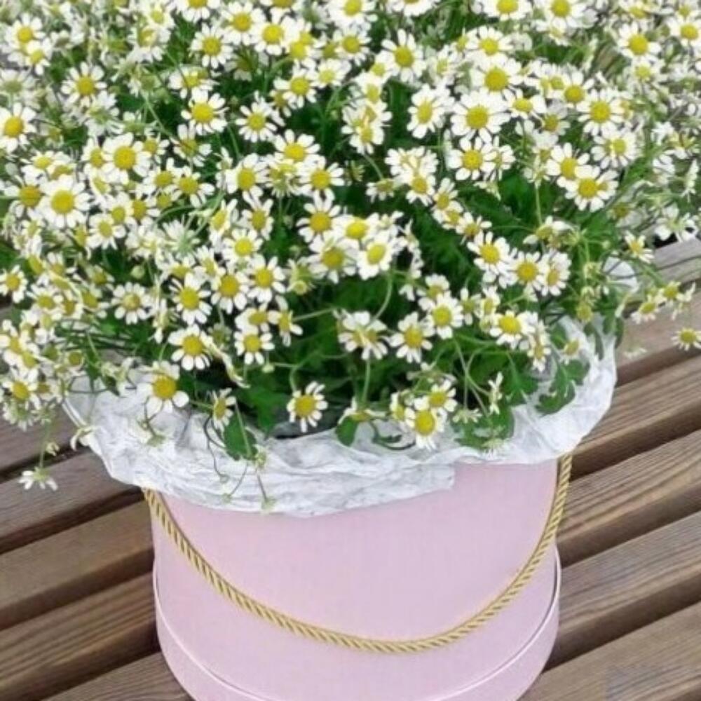 Ромашка кустовая – 25 шт.Шляпная коробка – 1 шт.Флористическая губка – 1 шт.Лента – 1 шт.