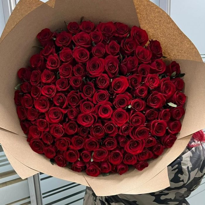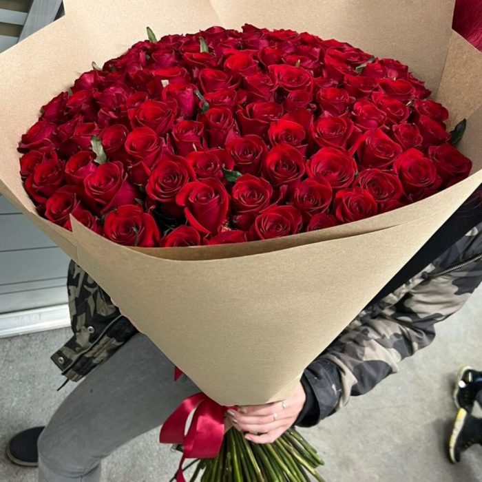 Лента атласная – 2 шт.Крафт – 5 шт.роза премиум красная 70 см – 101 шт.