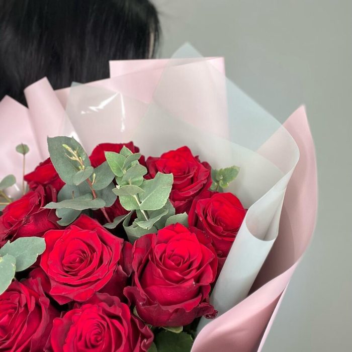Эвкалипт – 3 шт.Лента атласная – 1 шт.Роза Эксплорер – 11 шт.Упаковка дизайнерская – 2 шт.