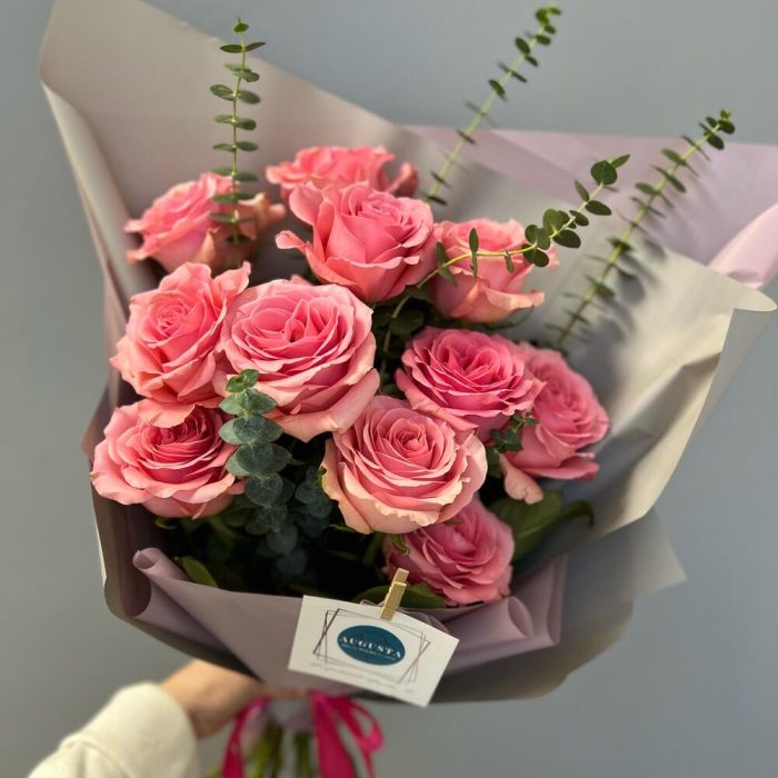 11 нежно-розовых роз с эвкалиптом