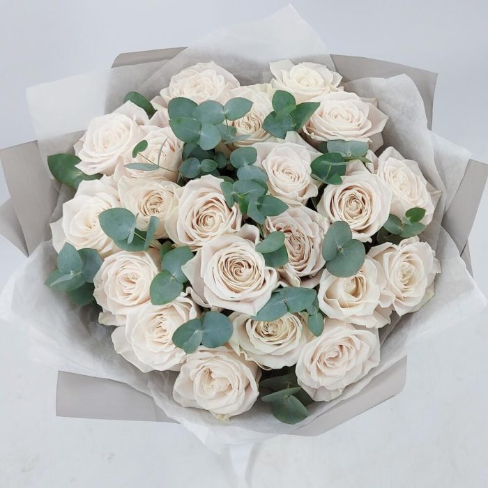 Роза Эквадор Премиум – 21 шт.эвкалипт цинерея пучок – 1 шт.Упаковка дизайнерская – 1 шт.