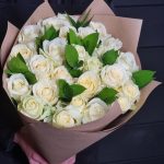 25 нежнейших роз с зеленью в крафте