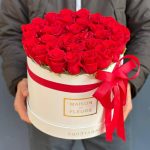 Лента атласная – 2 шт. Коробка шляпная – 1 шт. Роза голландия – 25 шт. Оазис флористический – 2 шт.